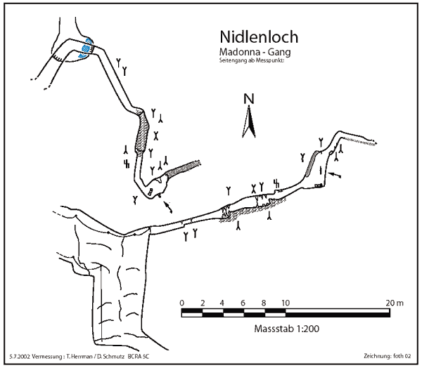Die Zeiten der grossen Neulandentdeckungen sind im Nidlenloch vorbei, weil erfolgsversprechende Grabstellen nur noch an schwer zugänglichen Stellen liegen. Alle heute bekannten Gänge sind vermessen und gezeichnet. Diese Messungen stammen aus den siebziger und achtziger Jahren. Sie entsprechen nicht dem heutigen Standard der Vermessungstechnik, was eine Nachvermessung notwendig macht. Bei der Nachvermessung der Höhle gibt es gelegentlich auch Überraschungen, wie beispielsweise die Entdeckung von 32 Metern Neuland im oberen Teil der Höhle. Der am 5.7.2002 entdeckte Madonna-Gang ist fürs Nidlenloch ausserordentlich schön geschmückt. Er wurde so benannt, weil ein Tropfstein dieses Ganges an eine Madonna mit Kind erinnert.